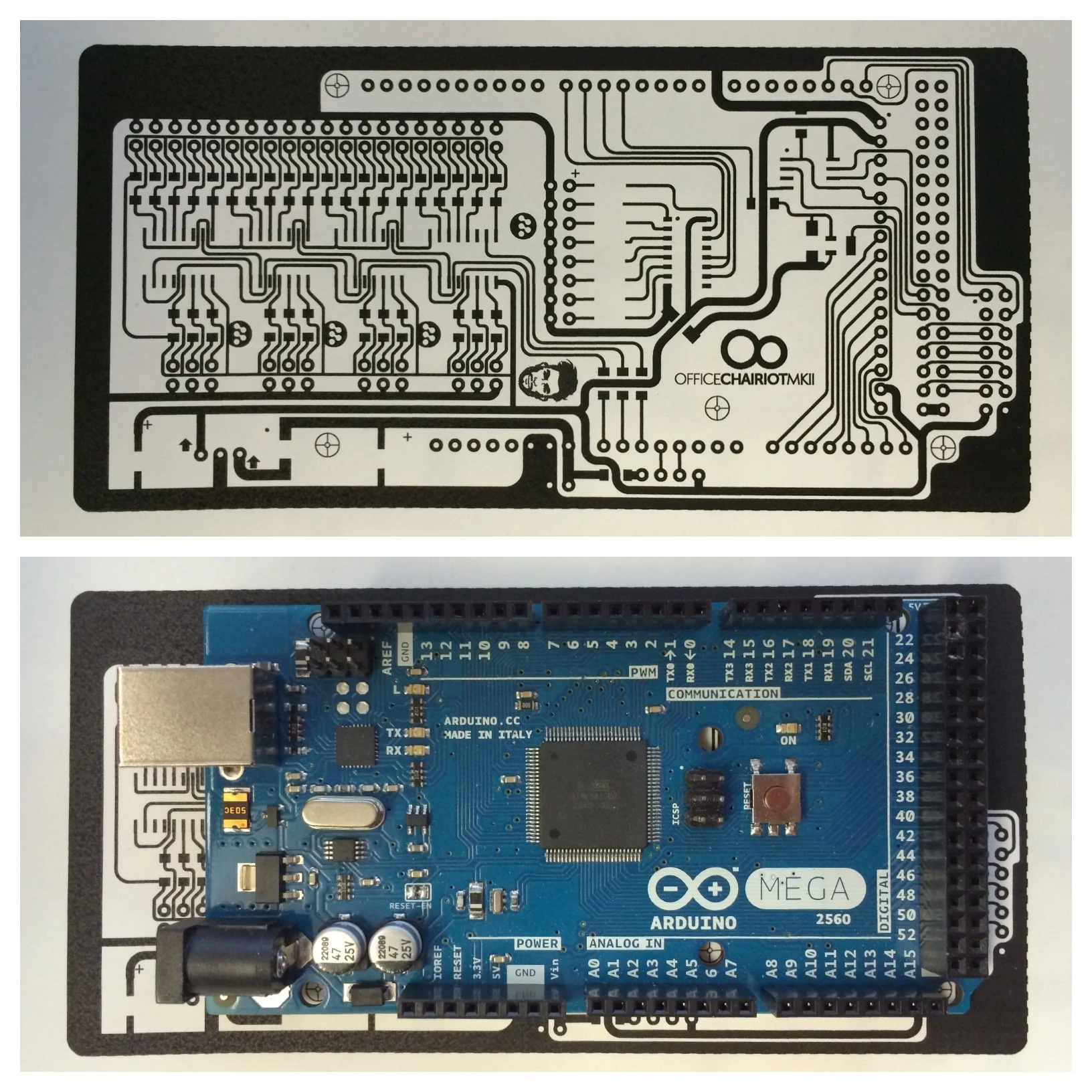 The main board for this beast is far and away the biggest and most complex circuit board I've ever designed. Er, well, that's not saying much given that I'm an amateur electronics guy with about 5 years of semi-decent experience. Here's a split-image of the printed board with and without the Arduino Mega 2560 on top (in reality, the circuit board would be plugged on top of the Arduino, but this image was a photo of me testing the pin registration between the two):